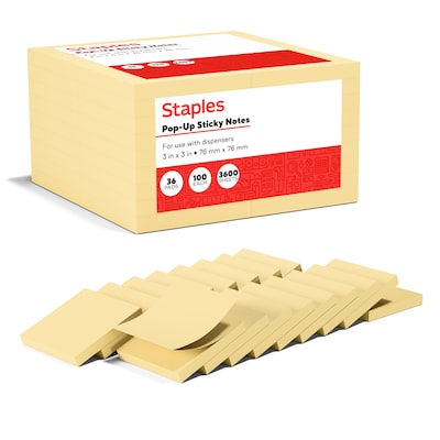 Leave messages and other notes with these recycled pop-up notes. The pop-up design makes it easy to grab a single note at a time, while the specially formulated adhesive lets you place them on nearly any hard surface. These Staples Stickies recycled yellow pop-up notes can be removed without leaving behind any sticky residue.