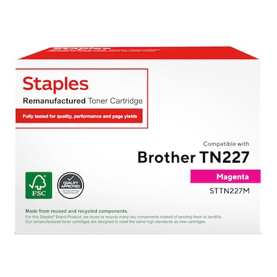 Manage daily document production tasks in your office with this remanufactured toner cartridge. The magenta toner offers vivid color, and the 2,300-page yield supports interruption-free printing. This Staples remanufactured Brother TN227M magenta toner cartridge works with select Brother printers for hassle-free installation and consistent print quality.