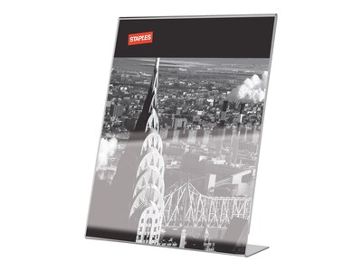 Post signage on waiting room tables or reception counters with this Staples L-shape frame. Clear plastic construction makes your message easy to read, and the sturdy base ensures stability on flat surfaces. This Staples L-shape frame features a side-loading design for easy setup.
