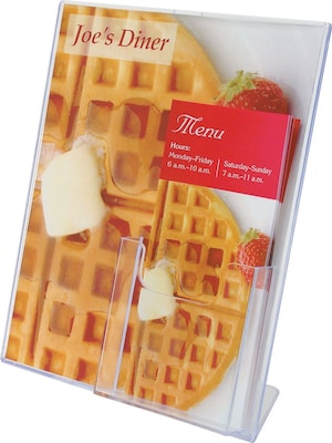 This Staples slanted sign with leaflet holder measures 8 1/2" x 11" and has polished edges to provide a high-quality look.