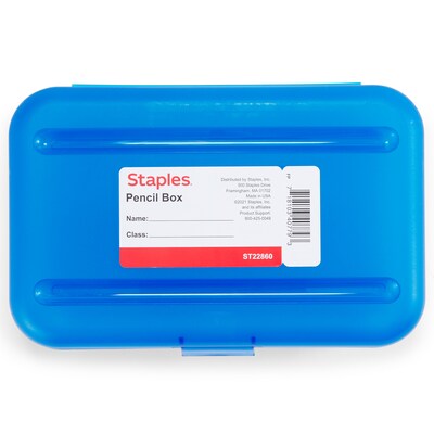 Organize your desk or study space with this Staples pencil box. A snap closure keeps pens, pencils and erasers safely tucked away inside, and the compact size fits in small desks, backpacks or box drawers. Durable plastic construction stands up to regular everyday use in the classroom or office. The blue color brings a fun look to this Staples pencil box, making it ideal for students and teachers alike.