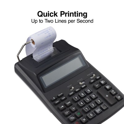 Bring speed and accuracy to your bookkeeping with this black desktop printing calculator. The 12-digit LCD screen provides a clear view of the numbers for accuracy, while tax calculation, cost, sell and margin functions help you reconcile accounts easily. Printing speeds of up to two lines per second offer quick documentation, while the included paper roll is easy to install for simple setup. Large, clearly labeled buttons help ensure accurate data input. This battery-powered Staples 12-digit display desktop printing calculator uses an AC adapter for uninterrupted performance, and the time function allows for timestamps on receipts for efficient record keeping.
