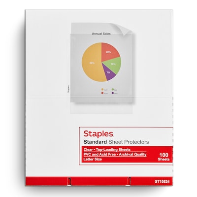 Staples sheet protectors keep your documents intact and protect paper from spills, dust and debris. The sheet protectors are made of PVC-free propylene plastic, which offers both durability and clear visibility to the documents inside. The sheet protectors can fit any document printed from a standard printer, and they are the right size to put in both binders and folders. Each pack contains 100 standard weight (2.4 mil) pieces that can be used by the whole office.