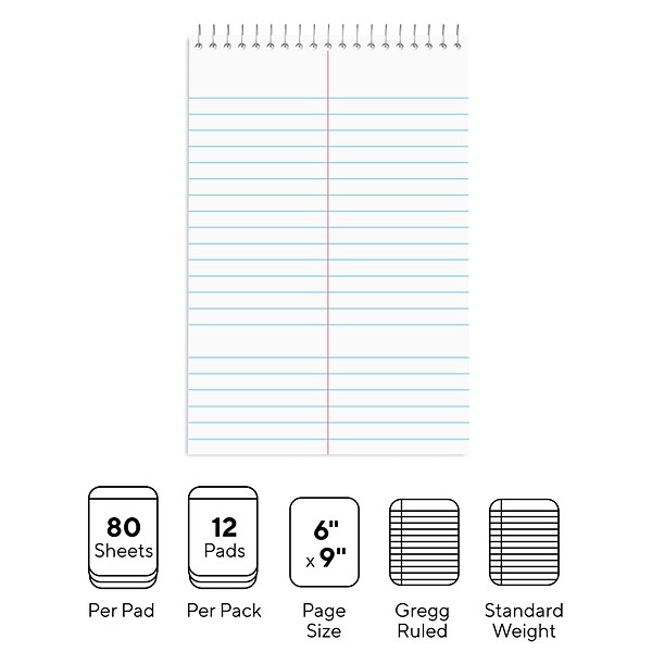 Supply your office with these white 80-sheet Gregg ruled notepads. The wired spiral top makes it easy to flip through pages, and each white page ensures your writing is easy-to-read. Standard Gregg ruling with red margins helps keep ideas organized. With 12 notepads in each pack, these Staples 6 x 9-inch white Gregg ruled notepads make it simple to stay stocked.
