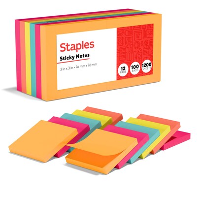 Staples Sticky Notes, 3" x 3", Dusk to Dawn Collection, 100 Sheets/Pad, 12 Pads/Pack (S-33BR12/52567)