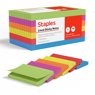 Add a splash of color to your reminders with Staples Notes from the Summer Breeze Collection. These 5" x 3" sticky notes are lined for organized writing and come in a pack of six pads, each containing 100 sheets. Perfect for jotting down quick thoughts or important reminders, these notes stick securely and remove cleanly.