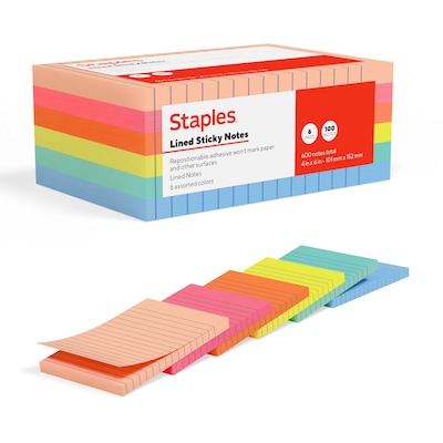 Staples Sticky Notes, 4" x 6", Golden Hour Collection, Lined, 100 Sheets/Pad, 6 Pads/Pack (ST62871)