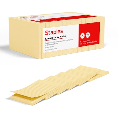 Staples Sticky Notes, 4" x 6", Sunshine Collection, Lined, 100 Sheets/Pad, 6 Pads/Pack (ST62872)