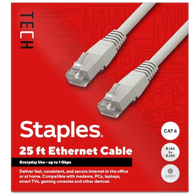 Connect high-speed network devices - like modems, PCs, laptops, smart TVs, gaming consoles and more - with this Staples TECH Ethernet cable. The 25-foot cable provides ample length to connect from across the room, while the CAT 6 configuration offers data transfer speeds up to 1 Gbps for fast performance. This Staples TECH CAT 6 Ethernet cable has snag-free RJ45 connectors for an efficient and stable signal between compatible devices. Backed by Staples Brands 100% satisfaction guarantee, or your money back.