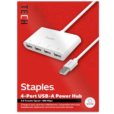 Never be without enough connection ports again. Connect USB-A peripheral devices - like mice, keyboards, headphones, and charging cords - for a completely connected workstation. Powered by USB 2.0, this hub promises fast data transfer speeds up to 480 Mbps. Measuring at just 3" x 5" this hub is compact and portable, perfect for on-the-go workers or smaller work spaces. Enjoy reliable and fast connectivity with the Staples TECH Four-Port Hub. Backed by Staples 100% Satisfaction Money Back Guarantee.