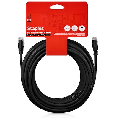 Connect high-speed network devices - like modems, PCs, laptops, smart TVs, gaming consoles and more - with this Staples TECH Ethernet cable. The 50-foot cable provides extra length to connect from across the room, while the CAT 6 configuration offers data transfer speeds up to 1 Gbps for fast performance. This Staples TECH CAT 6 Ethernet cable has snag-free RJ45 connectors for an efficient and stable signal between compatible devices. Backed by Staples Brands 100% satisfaction guarantee, or your money back.