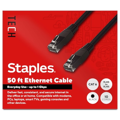 Connect high-speed network devices - like modems, PCs, laptops, smart TVs, gaming consoles and more - with these Staples TECH Ethernet cables. The 50-foot cables provide extra length to connect from across the room, while the CAT 6 configuration offers data transfer speeds up to 1 Gbps for fast performance. These Staples TECH CAT 6 Ethernet cables have snag-free RJ45 connectors for an efficient and stable signal between compatible devices. Pack of 10. Backed by Staples Brands 100% satisfaction guarantee, or your money back.