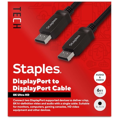 For work or entertainment an extra display often comes in handy. With the Staples TECH DisplayPort cable, you can connect additional monitors, displays, gaming consoles, projectors and more. Delivering crisp 8K Ultra HD resolution this cable promises clear audio and video for an exceptional experience. The compact 6-foot cord, provides ample length to connect devices across your work space while also reducing cord clutter. This cable is the perfect choice for outfitting your work, gaming or entertainment space. Enjoy high resolution audio and video so you can upgrade your home or office workspace and do your best work. Backed by Staples Brands 100% satisfaction guarantee, or your money back.
