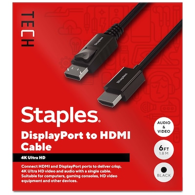 Delivering crisp 4K Ultra HD resolution this DisplayPort to HDMI cable promises clear audio and video for an exceptional experience. Featuring a compact 6-foot cord, this cable will reduce cord clutter while giving you ample length to connect devices across your work or entertainment station. This cord is the perfect choice for outfitting your work, gaming or media space. Enjoy high resolution audio and video between devices so you can upgrade your home or office workspace and do your best work. Backed by Staples Brands 100% satisfaction guarantee, or your money back.