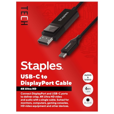 For work or entertainment an extra display often comes in handy. With the Staples TECH USB-C to DisplayPort cable, you can connect additional monitors, displays, gaming consoles, projectors and more. Delivering crisp 4K Ultra HD resolution this cable promises clear audio and video for an exceptional experience. The compact 6-foot cord, provides ample length to connect devices across your work space while also reducing cord clutter. This cable is the perfect choice for outfitting your work, gaming or entertainment space. Enjoy high resolution audio and video so you can upgrade your home or office workspace and do your best work. Backed by Staples Brands 100% satisfaction guarantee, or your money back.
