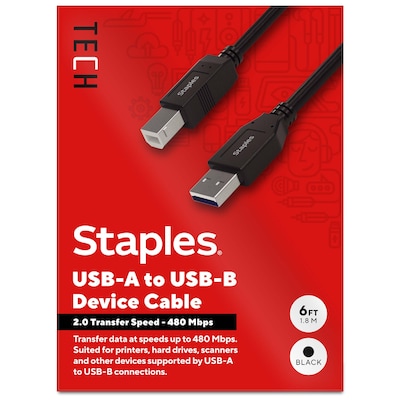 Connect peripheral devices like printers, copiers, external drivers and more with the Staples TECH USB-A to USB-B cable. The 6-foot cable is compact to reduce cord clutter, and the USB 2.0 boasts fast data transfer speeds up to 480 Mbps. Keep your workday running smoothly with the Staples TECH USB-A to USB-B cable. Backed by Staples Brands 100% satisfaction guarantee, or your money back.