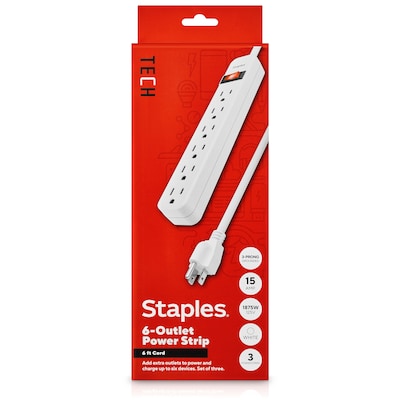 Staples TECH 6-Outlet Power Strip, 3' Cord, White, 3/Pack (42319)