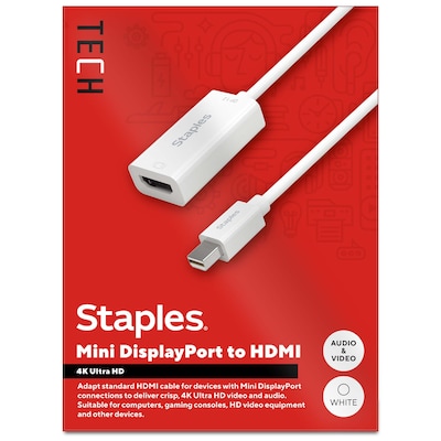 For work or entertainment, an extra screen often comes in handy. The Staples TECH Mini DisplayPort to HDMI adapter converts a Mini DisplayPort connection into HDMI output, allowing you to connect additional monitors, displays, gaming consoles, projectors and more. Delivering crisp 4K Ultra HD resolution this adapter promises clear audio and video for an exceptional experience. Featuring a compact 6-inch cord, this adapter will keep your work or entrainment space clutter free. This adapter is the perfect choice for outfitting your work, gaming or entertainment space and is compatible with Mac devices. Enjoy high resolution audio and video between previously incompatible devices so you can upgrade your home or office workspace and do your best work. Backed by Staples Brands 100% satisfaction guarantee, or your money back.