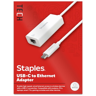 When wireless networks are unreliable, don't let your work be interrupted. With the Staples TECH USB-C to Ethernet adapter you can enable a wired internet connection to a wireless PC, laptop, gaming console or other USB-C equipped device. Delivering high speed data transfer up to 1 Gbps this adapter promises a seamless and reliable connection. Featuring a compact 6-inch cord, this adapter will keep your space clutter free. Backed by Staples Brands 100% satisfaction guarantee, or your money back.