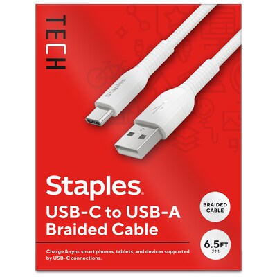 Charge and sync smartphones or tablets with this long and durable 6.5ft (2m) Staples® USB-C to USB-A Braided Cable.