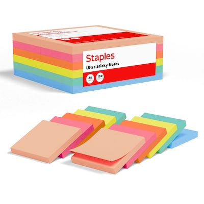 Add a pop of color to your reminders with Staples Ultra Sticky Notes. These 3" x 3" notes in the Golden Hour Collection stick securely to surfaces, ensuring your messages stay visible. With 100 sheets per pad and 24 pads per pack, you'll have plenty of notes to organize your thoughts and tasks.