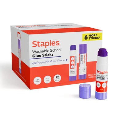 Staples Washable Glue Sticks offer vibrant purple adhesion in a convenient 36-pack.
