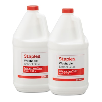 Refill glue bottles in your classroom or office with this 2-pack of Staples 1-gallon school glue. Complete art and craft projects with this school glue. The safe, nontoxic ingredients are ideal use in many situations, and the adhesive works with paper, wood, and other similar materials. With a washable formula, this glue can be removed from clothing and furniture. This Staples school glue comes packaged in two 1-gallon bottles, which have a convenient carrying handle and round spout for easy pouring.