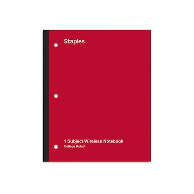 Ensure you always have somewhere to write down your thoughts with this wireless notebook. Letter-sized pages offer plenty of room to write notes, draw charts or record quick reminders, and college ruling helps you make efficient use of each page. Perforated pages remove easily so you can conveniently share handwritten ideas, figures and diagrams. The 3-hole punched design helps you fit this Staples Wireless 8.5 x 11-inch red 1-subject notebook into larger binders.