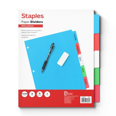 Staples Write & Erase Paper Dividers, Assorted Colors, 5-Tabs (13512/23180)