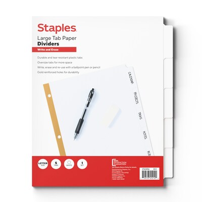 Keep your documents neatly sorted with these Staples Write & Erase Paper Dividers. Featuring five white tabs, these dividers allow for easy categorization and quick access to your files. The durable paper construction ensures long-lasting use. With a write and erase surface, you can easily label and relabel sections as needed, making these dividers a versatile addition to any binder.