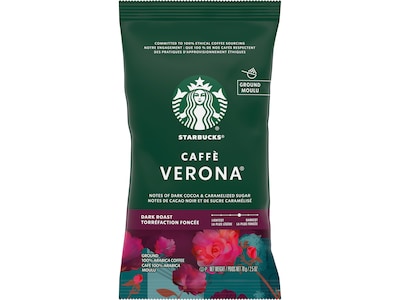 Indulge in the rich and well-balanced flavor of the Starbucks Caffe Verona ground coffee, a blend that captures the essence of a true coffee lover's delight. Originally created for a Seattle restaurant in 1975, this dark roast coffee has become a beloved favorite, known for its distinctive dark cocoa texture and roasty sweetness. Each 2.5 oz. bag is perfectly portioned to brew one pot of coffee, making it well-suited for any type of venue. Crafted with 100% Arabica beans, this coffee is not only delicious but also ethically sourced in partnership with Conservation International. The Starbucks Caffe Verona ground coffee provides a reliable and high-quality experience that your customers will love. Whether served in airpots or self-serve options, this coffee is great for satisfying every beverage occasion throughout the day.