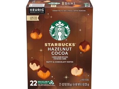 It's cozy season: enjoy the flavors of toasted hazelnut and sweet cocoa with the festive Starbucks Hazelnut Cocoa coffee pods. Rich and nutty flavors combine to make a deliciously comforting and warming cup for this special season. Only genuine K-Cup pods are designed by Keurig for your Keurig coffee maker, delivering a satisfying beverage in every cup. This limited-edition flavored ground coffee contains other natural flavors and is made without artificial flavors.