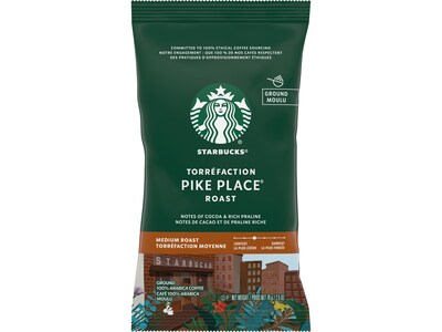 Experience the rich and smooth flavor of the Starbucks Pike Place roast coffee, a blend that embodies the essence of Starbucks' heritage. Inspired by the bustling atmosphere of Seattle's historic Pike Place Market, this medium roast coffee offers a harmonious balance, delivering subtle notes of cocoa and toasted nuts. Each 2.5 oz. bag is perfectly portioned to brew 10-12 cups, making it well-suited for any type of venue. Crafted with 100% Arabica beans, this coffee is not only delicious but also ethically sourced in partnership with Conservation International. The Starbucks Pike Place medium roast ground coffee provides a reliable and high-quality coffee experience that your customers will love. Whether served in airpots or self-serve options, this coffee is great for satisfying every beverage occasion throughout the day.