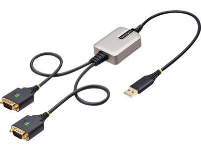 Add RS-232 serial communication support to USB-A enabled Data Terminal Equipment (desktop or laptop), using this StarTech 2' straight through two-port USB to serial adapter cable.