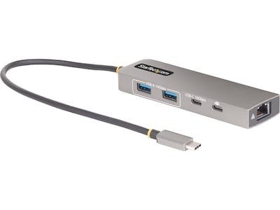 This StarTech USB Type-C hub with 2.5 Gigabit Ethernet and 100W USB Power Delivery pass-through adds three USB 3.2 Gen 2 (10Gbps) ports (two USB-A, one USB-C) to a USB-C enabled computer. Connect the USB hub to a USB-C port on a laptop, using the built-in 1ft (30cm) USB-C host cable. Charge a host laptop by connecting the host laptop's USB-C power supply to the USB Power Delivery (PD) 3.0 port. Backward compatibility with USB 2.0 (480Mbps) devices ensures support for a wide range of modern and legacy USB peripherals.