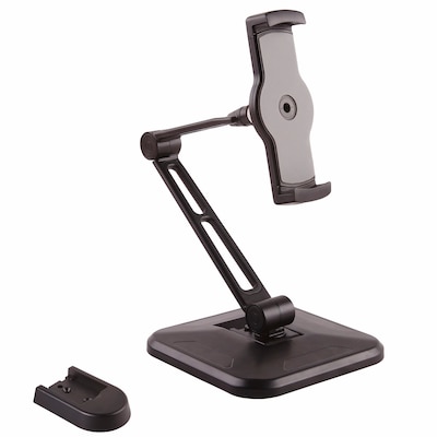 Integrate your iPad (including the 10.2" iPad or the 11" and 12.9" iPad Pro) or other tablet seamlessly into your workspace, with this adjustable tablet stand. Move the tablet arm up or down and rotate the tablet to adjust your viewing position instantly. The universal tablet stand rests securely on your desk, or you can mount it to a wall, or on the underneath surface of a cabinet or cupboard. With this highly adjustable tablet stand, you can maximize use of your tablet without having to hold it in your hand or place it down on your desk. Simply move the tablet arm up or down, with its two movable joints, to position your tablet at the perfect height. The tablet arm pivots 0 / +170 degrees at the base and -40 / +180 degrees at the elbow, to allow easy adjustment of the tablet positioning. Switch easily from portrait to landscape position, with 360 degree rotation. The clamp spreads apart easily to hold a tablet or phone from 4.7" to 12.9" in size, and up to 2.2 lbs. in weight. With its large base, the tablet stand rests securely on your desk, counter or other flat surface. A smaller base is also included, which lets you mount the tablet stand to a wall, or on the bottom surface of a work cabinet or kitchen cupboard, for a wide range of applications.