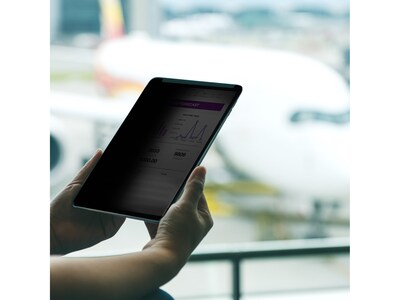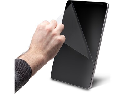 This StarTech 11" iPad Pro privacy screen smoothly transitions from a clear view to an obscured screen beyond the intended viewing angle, significantly enhancing visual privacy in office or public environments. The anti-glare matte finish helps to reduce reflections in glare-prone environments and provides additional screen protection with a scratch and fingerprint-resistant coating. The security filter ensures optimal privacy in portrait or landscape orientations when viewed beyond 30 degrees from the center, covering a total visible area of 60 degrees. It supports touchscreen input and gestures, preserving the interactive experience of an iPad while maintaining the confidentiality of on-screen content. The screen protector is compatible with all generations of the 11" iPad Pro and features a precise fit that does not interfere with the display, camera, or speakers. The included installation kit and step-by-step instructions allow for a one-time application to the iPad screen.