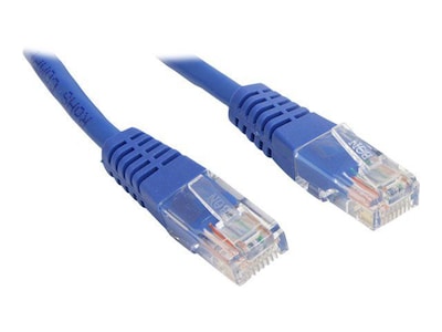 The StarTech M45PATCH12BL Cat 5e molded patch cable in blue, is 12' long and has PVC jacket for insulation. The cable has RJ-45 male connectors at both the ends for optimal conductivity while reducing corrosion due to signal loss. This cable includes high quality 24 AWG copper wire and features durable construction. This cable is suitable for use with fast Ethernet networks. The cable patches from hub to distribution panel and connects workstation to wall outlet.