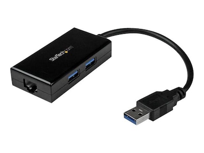 The StarTech USB31000S2H USB 3.0 to Gigabit network adapter with 2-port USB hub, offers full Gigabit bandwidth support for your laptop or tablet. This adapter provides wired network access with a 10/100/1000 RJ45 Ethernet port. It supports wake on LAN, up to 9K jumbo frame, auto MDIX, full duplex flow control, IEEE 802.1Q VLAN tagging and IEEE 802.3az energy-efficient Ethernet. This adapter is great for office or home use and allows quick access to very large files over a Gigabit network. It offers maximum data transfer rate of 5 Gb/s over USB 3.0 and 2 Gb/s over full duplex Gigabit Ethernet.