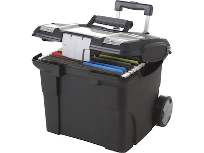 Move important documents around with this mobile file cart. The wheels make the cart fully portable so that it is easy to transfer documents from one space to another, and the moisture-resistant plastic material helps ensure the contents of the box remain safe from the elements. This Storex Premium mobile file cart is designed to hold letter-sized hanging folders, making it perfect for use as an extra file cabinet.
