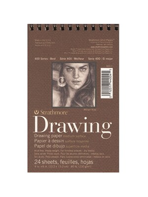 Strathmore 400 Series drawing paper pads contain acid-free, heavy weight, durable, medium surface 80 lb. drawing paper. Natural white paper is ideal for illustrations and final drawings. Suitable for any dry media, pen, ink, and light washes. Pads conta in 24 sheets and are spiral bound across the top (the first measurement listed). Pads 8 in. x 10 in. and larger are micro-perforated for clean and easy sheet removal.