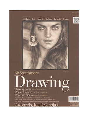 Strathmore 400 Series drawing paper pads contain acid-free, heavy weight, durable, medium surface 80 lb. drawing paper. Natural white paper is ideal for illustrations and final drawings. Suitable for any dry media, pen, ink, and light washes. Pads contain 24 sheets and are spiral bound across the top (the first measurement listed). Pads 8 in. x 10 in. and larger are micro-perforated for clean and easy sheet removal.