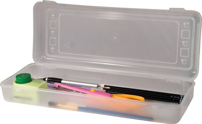 Pencil box conveniently stores your school or art supplies with a see-through design so you can easily view the items inside. Snap-shut latch secures your contents and prevents them from falling out. Durable socket, pin hinges and a secure double clasp design increase its strength for long-lasting use. Polypropylene pencil box fits easily in your backpack for easy carrying.