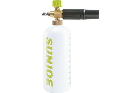 Give your car, truck, or boat a showroom shine with the 34 fl. oz. foam cannon pressure washer attachment from Sun Joe. This elite foam cannon provides maximum aeration of detergent to produce a thick, viscous layer of soapy suds that coat your vehicle's exterior to break down caked on road grime. The spray nozzle adjusts with a twist: from pinpoint jet to wide-angle fan spray. And the detergent dial at the top controls the soap to water ratio.