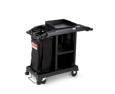 The compact HKC standard cart by Suncast commercial is a durable housekeeping and janitorial cart to keep you organized and on task. The top try allows for a variety of items that need to be easily accessed while in use. The two wall glides and bumpers are designed to protect the walls and reduce the chance of any costly wall damage. The included spacious standard bag can be used for collecting laundry or linens. This is the perfect cart to help you get the job done!