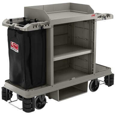 The Suncast Commercial premium housekeeping cart is our most innovative cart and durable cart. With the 360° adjustable caster system that allows for a fixed front caster mode, which keeps the housekeeping cart straight when desired, or full-range 360° movement, perfect for tight spaces, sharp corners, turn-arounds and side to side handling. The included spacious standard bag can be used for collecting laundry or linens, and the added lid will keep these items out of sight. This cart comes partially pre-assembled to save installation time. This is the perfect cart for all of your janitorial and housekeeping needs.