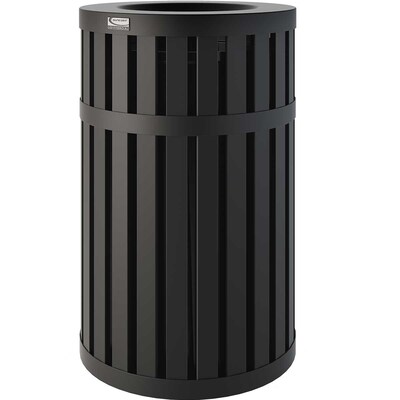 The 45 gallon round slatted metal trash can with canopy lid, is constructed of durable steel. This can comes fully assembled, including a round, high-density polyethylene liner, for easy waste removal. With a slatted design that has a powder coat finish, this can is weather resistant, making it perfect for indoor or outdoor environments.