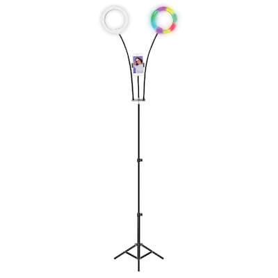 The Supersonic PRO Live Stream Double 8 In. LED Selfie RGB Ring Light with Tripod Stand is great for live-streaming, video chats, social media, and more. This dual ring light features 72 LED bulbs for warm/cool lights and 96 LED bulbs for RGB lights. It also comes with 3 color lighting modes: warm light (3,000K), cool white (4,500K), daylight (6,000K), and 10 brightness levels. The 360° rotatable phone holder ensures it is easy to adjust to desired angle, and extends up to 6.5 in. wide. It also come with an easily manageable, retractable tripod: just lock it at the desired height; extends from 22.8 in. to 64.56 in. With the in-line controller, you are able to power on/off, switch lighting modes, and adjust brightness levels.