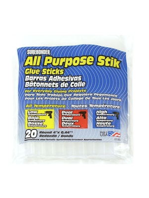 General purpose glue for use in high, low, and dual temperature regular-sized glue guns. On high or dual temp setting, bond metal, wood, fabric, magnets and plastic. On low or dual temp setting, bond delicate materials including, balloon, ribbon, lace, and children's crafts. Each round stick measures approximately 4 in. x 0.44 in.