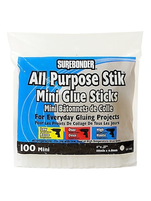 All Purpose Mini Glue Sticks can be use with a three glue gun setting: high, dual, and low. All purpose sticks are for everyday gluing projects. High and dual-temperature settings glue can be use on metal, fabric, magnets, and plastic. Using low or dual-temperature glue sticks can be use for delicate materials including balloons, ribbon, lace, and children's crafts. 4 in. x 0.28 in. each
